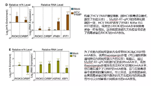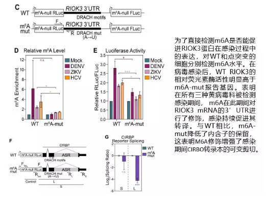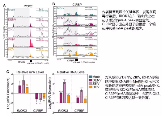 作者發(fā)現(xiàn)被黃病毒科(DENV 登革熱病毒、ZIKV 寨卡病毒、WNV 西尼羅河病毒 &HCV 丙型肝炎病毒)病毒感染后,細(xì)胞中 mRNA 的 m6A 修飾會發(fā)生改變,包括 RIOK3 和 CRRBP。在病毒感染期間,RIOK3 的 m6A 修飾會促進(jìn)其轉(zhuǎn)錄,然而 CIRBP 的 m6A 修飾丟失會促進(jìn)其轉(zhuǎn)錄本剪切編輯。作者還發(fā)現(xiàn)病毒感染引起的免疫應(yīng)答激活或內(nèi)質(zhì)網(wǎng)應(yīng)急反應(yīng)分別有助于 RIOK3 和 CIRBP 的 m6A 修飾。同樣 m6A 修飾發(fā)生改變的一些轉(zhuǎn)錄本,包括 RIOK3 和 CIRBP 等編碼蛋白會也影響病毒感染??偠灾?,這項工作揭示了病毒感染期間激活的信號通路會導(dǎo)致宿主 mRNAs 的 m6A 修飾變化進(jìn)而調(diào)控感染,說明發(fā)生 m6A 修飾的 mRNA 轉(zhuǎn)錄后調(diào)控會潛在影響病毒復(fù)制。