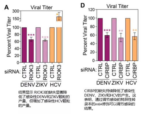 作者在 RIOK3 和 CIRBP 轉(zhuǎn)錄本都改變了 m6A 的修飾后,為探究其編碼的蛋白產(chǎn)物是否影響黃病毒科感染,使用小干擾 RNA (siRNA) 敲低了 Huh7 細(xì)胞中的 RIOK3 和 CIRBP 表達(dá),用 DENV、ZIKV 或 HCV 感染這些細(xì)胞,然后在感染后 72 小時后的上清液中測量病毒滴度。