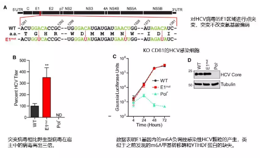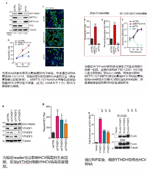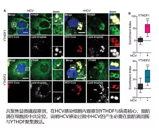 Stacy M. Horner 教授首先通過上述實驗對 m6A 修飾在病毒本身生命周期的作用探究后,確定了 m6A 甲基轉(zhuǎn)移酶負(fù)調(diào)控感染性 HCV 顆粒的產(chǎn)生,同時 m6A 結(jié)合的 YTHDF 蛋白均重新定位于 HCV 顆粒產(chǎn)生的位點,并抑制病毒感染的這一階段。數(shù)據(jù)顯示 m6A 修飾的改變調(diào)節(jié) HCV 感染,并為在更廣泛的黃病毒科病毒家族中探究 m6A 的功能奠定了基礎(chǔ)。