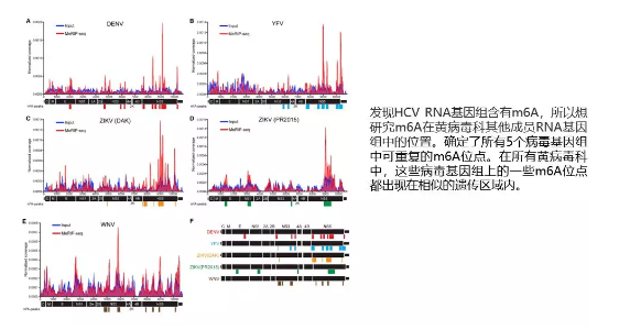作者在本文描述了 m6A 修飾在 HCV 病毒生命周期中的調(diào)控作用,證明了 m6A 甲基轉(zhuǎn)移酶負(fù)調(diào)控感染性 HCV 顆粒的產(chǎn)生,m6A 結(jié)合的 YTHDF 蛋白重新定位于 HCV 顆粒產(chǎn)生的位點,并抑制病毒感染的這一階段。抑制 m6A 修飾會增強(qiáng)病毒滴度,增加 HCV RNA 與 HCV 核心蛋白的相互作用。描述了其他幾種黃病毒科的 m6A 修飾情況,包括 ZIKV, DENV, WNV,和 YFV??傊?,數(shù)據(jù)顯示 m6A 修飾調(diào)節(jié) HCV 感染,并為更深入的探究 m6A 在黃病毒科病毒家族中的功能奠定了基礎(chǔ)。值得一提的是,文章中的病毒基因組并不是單獨提取得到,而是與宿主細(xì)胞一起提取出 total RNA,再進(jìn)行 MeRIP-seq,分別與宿主和病毒基因組進(jìn)行比對,從而得到病毒基因組上 m6A 整體修飾情況。