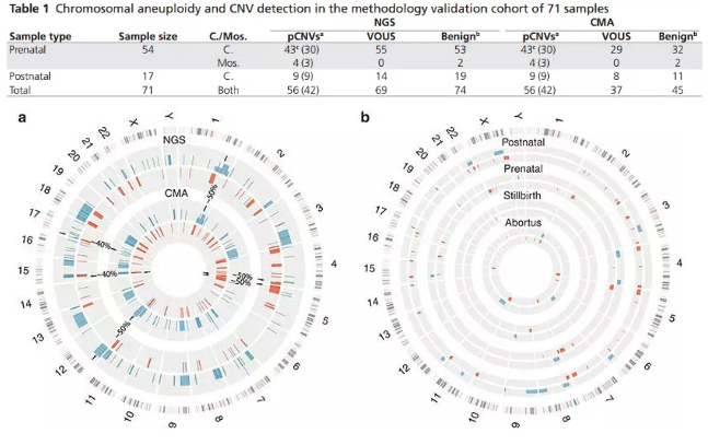 該團隊使用低覆蓋度的全基因組測序流程,對 570 名患者的多中心組進行了全基因組 CNV 分析(> 50 kb)和芯片檢測分析。根據(jù)美國醫(yī)學(xué)遺傳學(xué)和基因組學(xué)指南對 CNV(即致病性 CNV,pCNV)進行了分類。結(jié)果發(fā)現(xiàn),CMA 和基于 NGS 的方法在 71 個驗證樣本中的 pCNV 的結(jié)果一致(如下圖表)。