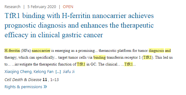 TfR1 與鐵蛋白抗原納米載體綁定實現(xiàn)了臨床上胃癌預(yù)后診斷并增強治療的功效