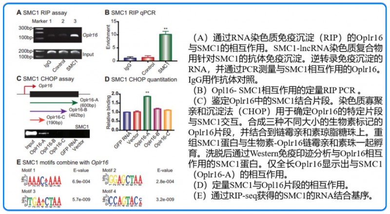 研究團隊先前已發(fā)現(xiàn)了啟動子 - 增強型染色體內(nèi)環(huán)結(jié)構(gòu),對于啟動和維持干細胞多能性至關(guān)重要。本研究也使用染色質(zhì)構(gòu)象捕獲(3C)的方法驗證 Oplr16 是否參與該染色質(zhì)內(nèi)環(huán),結(jié)果檢測到 E14 細胞的多能性相關(guān) 3C 環(huán),但敲除 Oplr16 可以改變這種染色體內(nèi)環(huán)結(jié)構(gòu)。使用 SMC1 RNA 染色質(zhì)免疫沉淀(RIP)分析 Oplr16 與 SMC1 相互作用。