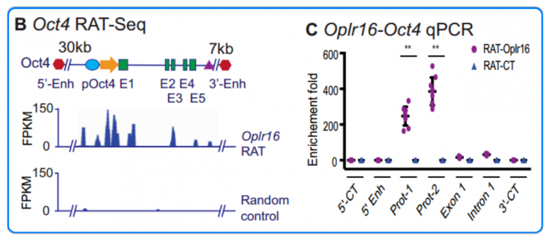 使用 RNA 逆轉(zhuǎn)錄相關(guān)陷阱測序(RAT-seq)方法來分析 Oplr16 的靶基因。分析顯示 Octr16 在 Oct4 基因座富集,在啟動子區(qū)域有一個峰,對照大鼠在該基因座處未顯示結(jié)合峰。定量 PCR 也顯示 Oplr16 在 Oct4 的啟動子區(qū)域富集。