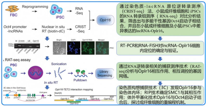 潛在的多能性相關(guān)的 lncRNA 應滿足兩個標準能力,首先,具有調(diào)節(jié)干細胞核心因子基因例如 Oct4,Sox2 和 Nanog 的能力。其次,響應多能性狀態(tài)而差異表達。本文作者提出了一種新穎的策略來尋找滿足這兩個標準的潛在 lncRNA。使用染色質(zhì) RNA 原位逆轉(zhuǎn)錄測序(CRIST-seq)方法確定哪些 lncRNA 與 Oct4 啟動子相互作用,然后使用常規(guī)的 RNA 轉(zhuǎn)錄組測序(RNA-seq)來鑒定可能與多能性重編程相關(guān)的差異表達的 lncRNA。RNA-seq 用于鑒定在重編程過程中收集的成纖維細胞和 iPSC 之間差異表達的 RNA。進一步鑒定  Oplr16 是多能性相關(guān)的 lncRNA。作者分離了細胞質(zhì)和核 RNA 進行亞細胞分級測定。RT-PCR 顯示,Oplr16 主要位于細胞核中(圖 1C)。RNA-FISH 分析也驗證了其在 iPSC 中的核定位(圖 1D)。這些結(jié)果表明 Oplr16 是在體細胞重編程過程中被激活的小鼠核 lncRNA。