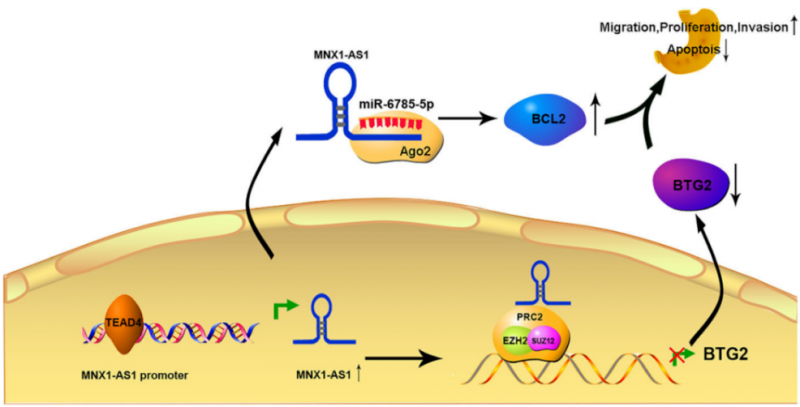 該模型描述了 lncRNA MNX1-AS1 促進胃癌發(fā)生發(fā)展的分子機制。