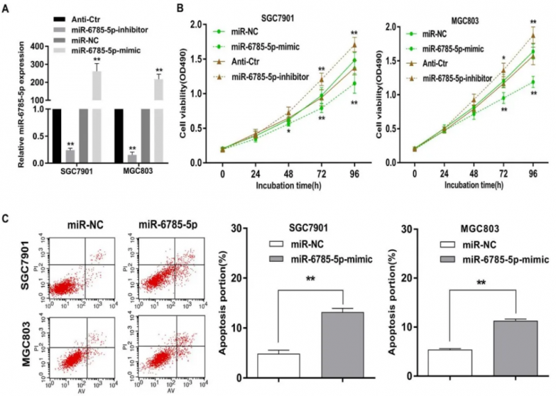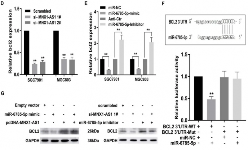 BCL2 是 miR-6785-5p 的靶點,被 MNX1-AS1 缺失所抑制。a. 使用 qRT-PCR 檢測轉(zhuǎn)染了 miR-6785-5p mimic 或 miR-6785-5p 抑制劑的 GC 細胞中的 miR-6785-5p,并與對照組比較。b. 采用 MTT 法研究 miR-6785-5p 表達改變對 GC 中細胞活力的影響。c. SGC7901 和 MGC803 細胞進行細胞凋亡染色分析。隨著 MNX1-AS 基因的下調(diào),BCL2 在 GC 細胞中的表達水平明顯降低。e. qRT-PCR 檢測 miR-6785-5p 調(diào)節(jié)異常對 SGC7901 和 MGC803 細胞 BCL2 表達的影響。f. 推測 miR-6785-5p 在 WT 和 BCL2 的 Mut 3’UTR 中的靶向位點的預(yù)測結(jié)果。MiR-6785-5p 可以與 BCL2 mRNA 的 3'UTR 中的預(yù)測位點結(jié)合。g. Western blot 檢測結(jié)果顯示,miR-6785-5p 過表達可損害 MNX1-AS1 過表達介導(dǎo)的 BCL2 上調(diào),而抑制 miR-6785-5p 可降低 MNX1-AS1 敲低誘導(dǎo)的 BCL2 下調(diào)