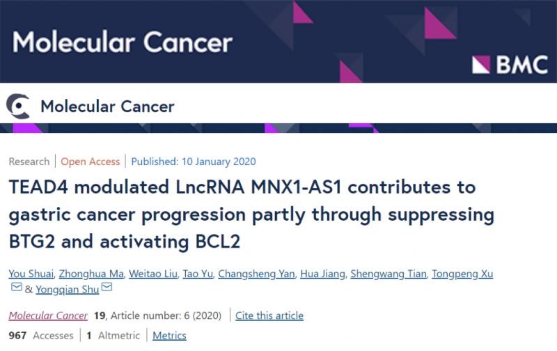 該文章是 2020 年 1 月南京醫(yī)科大學(xué)附屬第一醫(yī)院的研究團隊發(fā)表在 Molecular Cancer(IF=10.68)雜志上的,文章標(biāo)題為“TEAD4 modulated LncRNA MNX1-AS1 contributes to gastric cancer progression partly through suppressing BTG2 and activating BCL2”。文章研究發(fā)現(xiàn)受轉(zhuǎn)錄因子 TEAD4 表達調(diào)控的 lncRNA MNX1-AS1 可以通過抑制靶基因 BTG2 的表達來參與調(diào)控胃癌進展,同時 MNX1-AS1 可以通過 ceRNA 調(diào)控機制激活 BCL2 的表達來參與調(diào)控胃癌進展。區(qū)別于常規(guī)的在一篇文章里只進行一種 lncRNA 作用模式研究,該文同時進行了兩種,而且數(shù)據(jù)分析透徹,實驗內(nèi)容充足,小伙伴們可以學(xué)習(xí)起來哦。