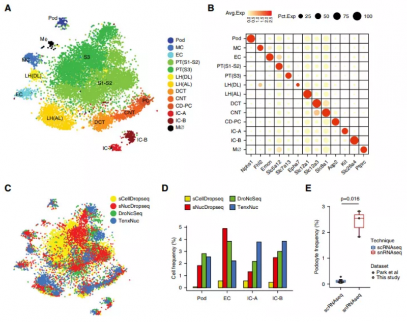 圖:snRNA-seq 相對于 scRNA-seq 技術(shù)具有較低的解離偏差。(A) tSNE 顯示了 13 個細胞類群。(B) 不同類群的標記基因表達。(C) tSNE 顯示每個平臺的數(shù)據(jù)對所有集群的貢獻。(D) 每個平臺貢獻的細胞百分比顯示,與 snRNA-seq 相比,scRNA-seq 技術(shù)對足細胞、內(nèi)皮細胞和夾層細胞的檢出率非常低 (E) snRNA-seq(2.4%)檢測出的足細胞是 scRNA-seq(0.12%)的 20 倍。