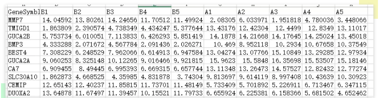 如下圖,首列是 gene symbol,geneID 或者 probe,后邊是每個樣本的信號值 / 測序 FPKM 值。