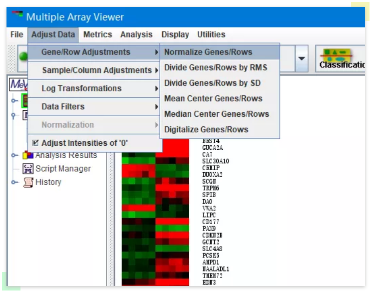adjust data---Gene/Row Adjustments---Normalize Gene/Rows