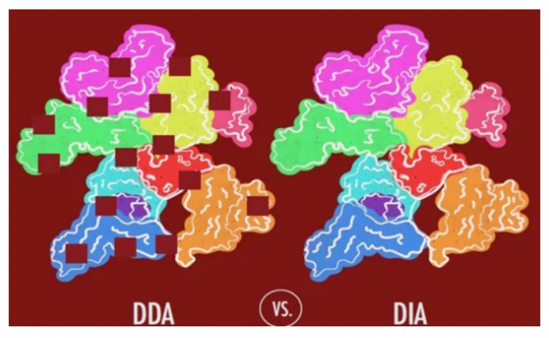 和上面的三種技術(shù),非常高級(jí)似乎全能的 DIA 技術(shù)是升級(jí)換代式的進(jìn)步。上面的三種,采用的是 DDA(data-dependent acquisition,數(shù)據(jù)依賴采集)數(shù)據(jù)采集方式,其策略是對(duì)響應(yīng)高的部分母離子進(jìn)行二級(jí)采集。而 DIA(Data Independent Acquisition,數(shù)據(jù)非依賴采集)采用了不同的數(shù)據(jù)采集模式:將質(zhì)譜整個(gè)全掃描范圍分為若干個(gè)窗口,然后對(duì)每個(gè)窗口中的所有離子進(jìn)行檢測(cè)、碎裂,從而無(wú)遺漏、無(wú)差異地獲得樣本中所有離子的信息,實(shí)現(xiàn)了從傳統(tǒng)的機(jī)槍掃射的方式向?qū)椶Z炸方式的采集方式轉(zhuǎn)變。