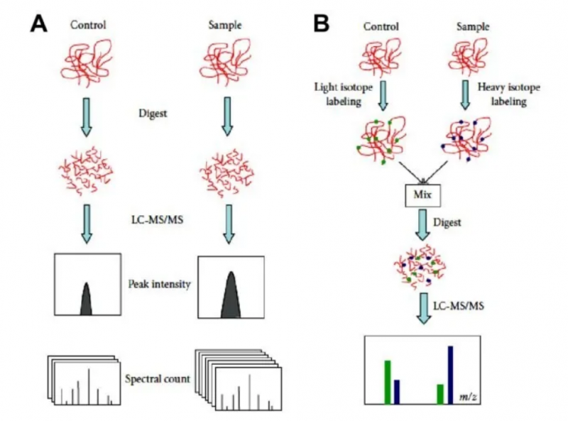 圖   label free(A) 和穩(wěn)定同位素標(biāo)記定量(B) 之間的差異。Label free 定量包括兩個(gè)獨(dú)立進(jìn)行的分析,然后進(jìn)行比較。通過(guò)穩(wěn)定同位素標(biāo)記的定量可以直接比較同位素標(biāo)記的肽對(duì)。LC-MS/MS,液相色譜 - 串聯(lián)質(zhì)譜聯(lián)用。
