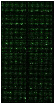 蛋白芯片 類似于基因芯片,固相的板面上有整齊地排列著一個(gè)一個(gè)小點(diǎn),這些小點(diǎn)可能是各種抗體,也可能是各種基因組的蛋白質(zhì)。通過(guò)抗原抗體及顯色反應(yīng),芯片上顯出或者亮或暗的點(diǎn),以此篩查各種信號(hào)通路、蛋白表達(dá)。