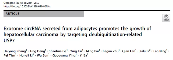 中文題目:脂肪細胞外泌體 circRNA 通過靶向去泛素相關的 USP7 促進肝癌的生長