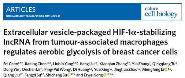 本文研究發(fā)現(xiàn)腫瘤相關巨噬細胞(TAM)通過分泌外泌體加強乳腺癌細胞的糖酵解,并且增強其抗凋亡活性。進一步研究發(fā)現(xiàn)是外泌體中的一種髓系 lncRNA——HISLA 在此調控中起主要作用。機制研究結果表明,HISLA 是通過阻滯 PHD2 和 HIF-1α 的相互作用,從而抑制了 HIF-1α 的羥基化和降解。而相反的是腫瘤細胞糖酵解分泌的乳酸對巨噬細胞的 HISLA 具有上調作用,在腫瘤與 TAMs 之間形成了一個正反饋代謝調控環(huán)路。沉默外泌體中的 HISLA,可有效的抑制乳腺癌的糖酵解和化療抗性。臨床實驗發(fā)現(xiàn),HISLA 在 TAMs 中的表達與乳腺癌患者的糖酵解、化療效果差異和生存期長短具有相關性。該研究強調了 lncRNAs 作為細胞信號傳遞載體的潛力,它被包裹于巨噬細胞釋放的外泌體中,在腫瘤微環(huán)境中進行細胞之間的傳遞,調控著腫瘤的代謝活動。更為重要的是,這項研究可能為腫瘤的免疫治療提供了頗具前景的新靶點。