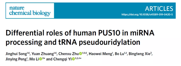 Differential roles of human PUS10 in miRNA processing and tRNA pseudouridylation.