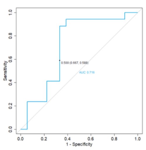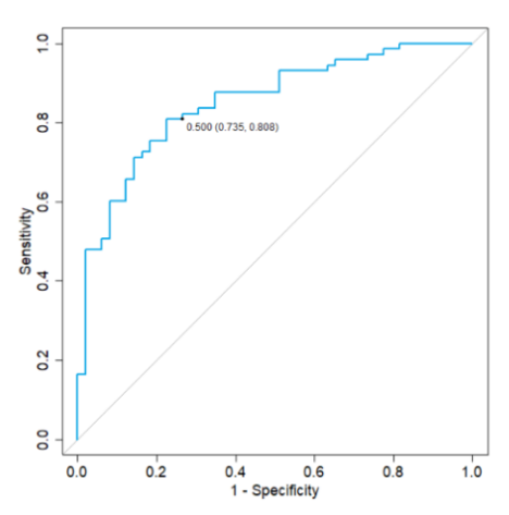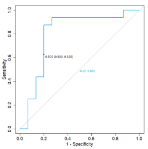 在診斷預(yù)測(cè)后,對(duì) 13 名預(yù)測(cè)診斷與風(fēng)濕科醫(yī)生  zuì  初所做的診斷不同的患者進(jìn)行了臨床重新評(píng)估。對(duì)于這些患者中的 4 名,仍然無(wú)法確定診斷,因?yàn)樗麄円恢比狈Κ?dú)特的臨床參數(shù)。研究者從驗(yàn)證隊(duì)列中刪除了這四個(gè)個(gè)體,重新計(jì)算了預(yù)測(cè)匹配率,增加到 71.0%,并進(jìn)行了新的 ROC 分析,結(jié)果提高了敏感度(62.5%) 和特異度(80.0%)(圖 9)。