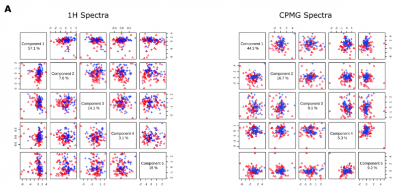 對(duì) 1H 單脈沖和 CPMG NMR 光譜進(jìn)行多變量統(tǒng)計(jì)分析,以確定是否存在可區(qū)分兩種疾病的特征光譜圖或峰。根據(jù)偏 zuì小二乘判別分析(PLS-DA)和隨機(jī)森林模型,臨床或人口統(tǒng)計(jì)學(xué)協(xié)變量與 1H(圖 1)和 CPMG(數(shù)據(jù)未顯示)光譜區(qū)域之間沒(méi)有顯著相關(guān)性。