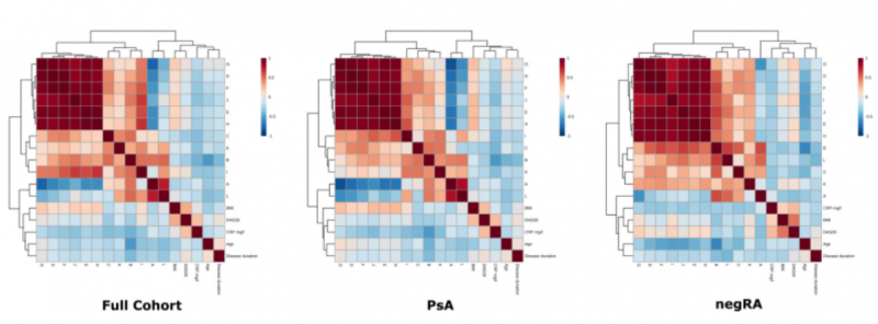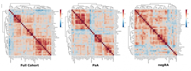 圖 2    顯示了臨床 / 人口統(tǒng)計(jì)學(xué)變量與 1H 光譜區(qū)域之間的 Pearson 相關(guān)系數(shù),以及用于發(fā)現(xiàn)隊(duì)列,PsA 和 negRA 組的歐幾里德度量的分層聚類