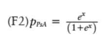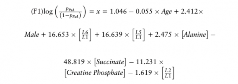 每種代謝物的濃度、年齡和性別(男性 =1,女性 =0) 代入公式中。然后,通過(guò)替換在 F1 中獲得的結(jié)果×來(lái)計(jì)算屬于 PsA 組的概率: