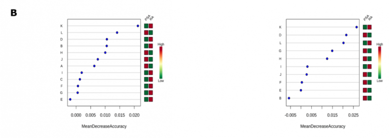 類風(fēng)濕性關(guān)節(jié)炎(RA)的診斷主要基于臨床癥狀和類風(fēng)濕因子(RF),抗瓜氨酸肽抗體(抗CCP)的血清學(xué)陽(yáng)性,而銀屑病關(guān)節(jié)炎(PsA)只有臨床和影像學(xué)特征有助于診斷。雖然大多數(shù)RA患者RF,抗CCP血清陽(yáng)性,但約15%-20%的RA病例中,血清中RF和抗CCP水平并未升高,由于血清陰性RA(negRA)和PsA的癥狀非常相似,且沒(méi)有可靠的臨床標(biāo)志物,因此 ,兩者的鑒別診斷十分困難。