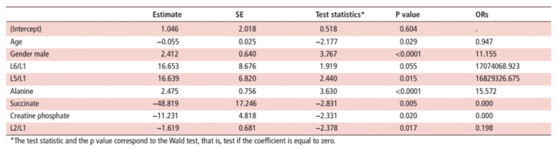 通過(guò)逐步向前 - 向后選擇算法,以下診斷預(yù)測(cè)因子已包括在診斷模型中:年齡,性別,L6 / L1,L5 / L1,L2 / L1,丙氨酸,琥珀酸和磷酸肌酸。