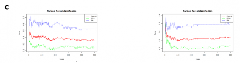 單一代謝物或脂質(zhì)比例的  ROC 分析得到的曲線下面積(AUC) 小 70%。因此,單變量模型對(duì) PsA 和 negRA 患者的鑒別的敏感性和特異性低。為了達(dá)到高的診斷準(zhǔn)確率,研究者建立了三種不同的機(jī)器學(xué)習(xí)算法:隨機(jī)森林算法、樸素貝葉斯算法和多元 Logistic 回歸算法,對(duì) 73 例 PsA 和 49 例 negRA 患者的代謝組和脂質(zhì)組進(jìn)行了分析。隨機(jī)森林預(yù)測(cè) PsA 的準(zhǔn)確率 73.3%(Cohen‘s kappa 40.1%),樸素貝葉斯準(zhǔn)確率為 63.7%(Cohen’s kappa 26.5%)。
