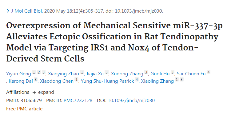 肌腱病,以肌腱異位骨化為特征,在某些人群中是一種常見疾病,比如那些肌腱重復(fù)性勞損的運(yùn)動員。然而,肌腱過度使用引起的肌腱病變的分子機(jī)制仍然缺乏。在這里,作者發(fā)現(xiàn)機(jī)械敏感性 miRNA,miR-337-3p,在單軸周期性機(jī)械負(fù)荷下,在腱源性干細(xì)胞(TDSCs)及陰性對照的軟骨成骨細(xì)胞分化而來的 TDSCs 種,表達(dá)較低。重要的是,miR-337-3p 在大鼠和人鈣化肌腱中的表達(dá)均下調(diào),而在大鼠肌腱病變模型的髕腱中 miR-337-3p 的過表達(dá)則顯示出強(qiáng)大的治療效果。在機(jī)制上,作者發(fā)現(xiàn)促炎細(xì)胞因子白細(xì)胞介素 -1β 是 miR-337-3p 的上游,它將機(jī)械負(fù)荷與 miR-337-3p 的下調(diào)聯(lián)系起來。此外,miR-337-3p 的靶基因,NADPH 氧化酶 4 和胰島素受體底物 1,分別通過 JNK 和 ERK 信號激活 TDSCs 的軟骨成骨分化。因此,這些發(fā)現(xiàn)不僅為肌腱病異位骨化的分子機(jī)制提供了新的見解,而且也突出了 miR-337-3p 作為臨床治療肌腱病的一個可能靶點(diǎn)的意義。