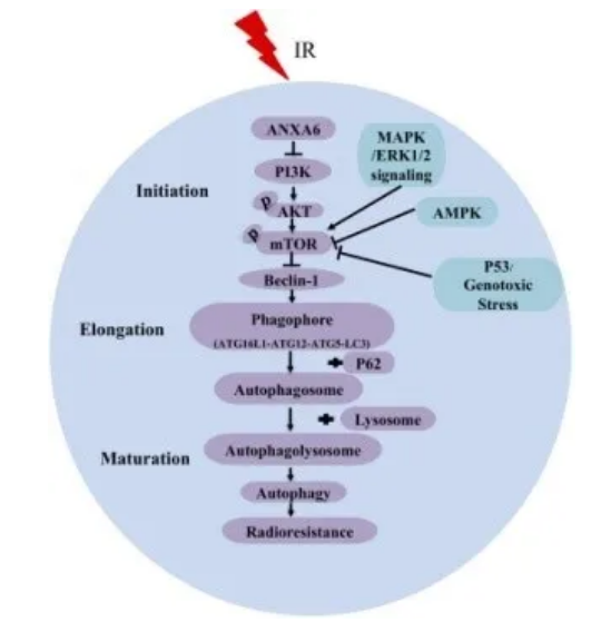 放療是鼻咽癌常規(guī)有效的治療方法,但也有失敗的可能,主要原因是放療耐藥導(dǎo)致腫瘤殘留或復(fù)發(fā)。然而,鼻咽癌耐輻射的機(jī)制和預(yù)測標(biāo)記仍不清楚。在本研究中,作者采用串聯(lián)質(zhì)譜標(biāo)記(Tandem Mass Tag) 對鼻咽癌細(xì)胞進(jìn)行定量蛋白組學(xué)分析,并對不同放射敏感性的鼻咽癌臨床樣本進(jìn)行基因芯片分析,確定 Annexin A6 (ANXA6) 作為候選的耐輻射標(biāo)記物。結(jié)果發(fā)現(xiàn),高表達(dá) ANXA6 與鼻咽癌的耐輻射能力呈正相關(guān),siRNA 抑制 ANXA6 可提高鼻咽癌的耐輻射能力。與原代細(xì)胞相比,建立的耐輻射鼻咽癌細(xì)胞的自噬發(fā)生率增加,LC3 siRNA (siLC3) 使鼻咽癌細(xì)胞對輻射敏感,從而抑制自噬。此外,ANXA6 siRNA (siANXA6) 通過激活 PI3K/AKT/mTOR 通路抑制細(xì)胞自噬,導(dǎo)致放射增敏。聯(lián)合 siANXA6 和 CAL101(一種 PI3K、p-AKT 和 mTOR 的抑制劑,同時)顯著逆轉(zhuǎn)上述 sianax6 減少的自噬。CAL101 對 PI3K/AKT/mTOR 的抑制也在負(fù)反饋過程中增加了 ANXA6 的表達(dá)。綜上所述,本研究發(fā)現(xiàn) ANXA6 通過抑制 PI3K/AKT/mTOR 通路促進(jìn)自噬,從而有助于鼻咽癌的耐輻射。這一發(fā)現(xiàn)的意義在于,ANXA6 可作為鼻咽癌放療后預(yù)后的一種新的預(yù)測生物標(biāo)志物。
