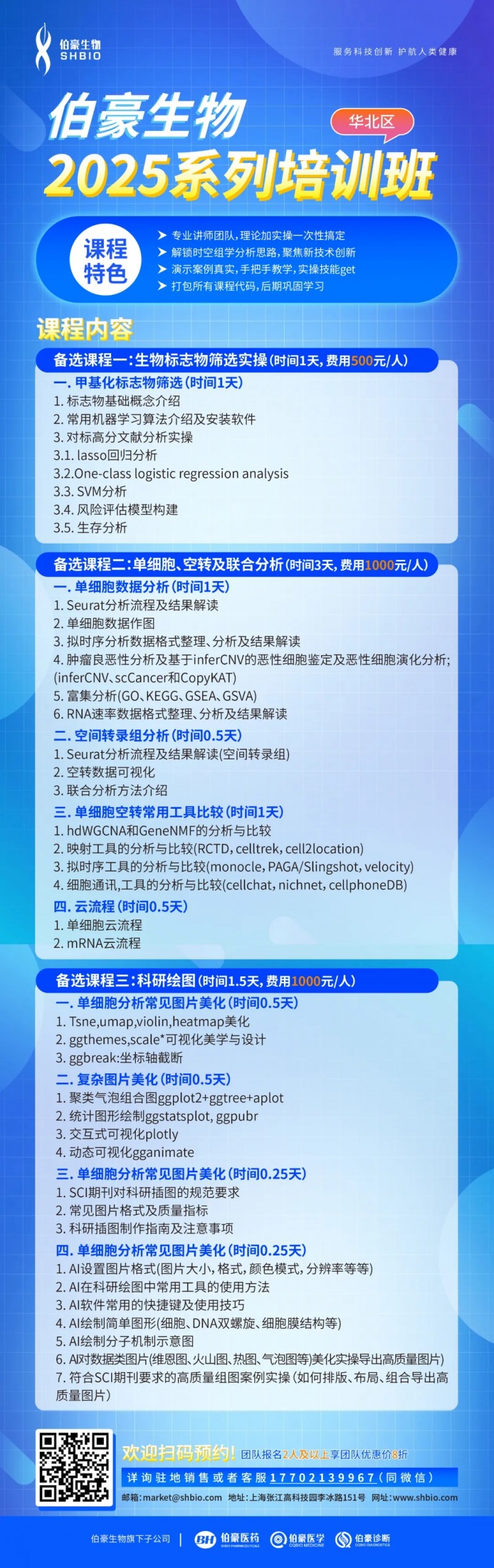 備選一:甲基化標(biāo)志物篩選「1 天,費(fèi)用:500 元 / 人」 1. 標(biāo)志物基礎(chǔ)概念介紹 2. 常用機(jī)器學(xué)習(xí)算法介紹及安裝軟件 3. 對(duì)標(biāo)高分文獻(xiàn)分析實(shí)操 3.1.lasso 回歸分析 3.2.0ne-class logistic regression analysis 3.3.SVM 分析 3.4. 風(fēng)險(xiǎn)評(píng)估模型構(gòu)建 3.5. 生存分析 備選二:單細(xì)胞、空轉(zhuǎn)及聯(lián)合分析「時(shí)間 3 天,費(fèi)用 1000 元 / 人」 (一)單細(xì)胞數(shù)據(jù)分析「時(shí)間 1 天」 1.Seurat 分析流程及結(jié)果解讀 2. 單細(xì)胞數(shù)據(jù)作圖 3. 擬時(shí)序分析數(shù)據(jù)格式整理、分析及結(jié)果解讀 4. 腫瘤良惡性分析及基于 inferCNV 的惡性細(xì)胞鑒定及惡性細(xì)胞演化分析:(inferCNV、scCancer 和 CopyKAT) 5. 富集分析(GO、KEGG、GSEA、GSVA) 6.RNA 速率數(shù)據(jù)格式整理、分析及結(jié)果解讀 (二)空間轉(zhuǎn)錄組分析「時(shí)間 0.5 天」 1.Seurat 分析流程及結(jié)果解讀(空間轉(zhuǎn)錄組) 2. 空轉(zhuǎn)數(shù)據(jù)可視化 3. 聯(lián)合分析方法介紹 (三)單細(xì)胞空轉(zhuǎn)常用工具比較 「 時(shí)間 1 天」 1.hdWGCNA 和 GeneNMF 的分析與比較 2. 映射工具的分析與比較(RCTD,celltrek,cell2location) 3. 擬時(shí)序工具的分析與比較(monocle,PAGA/Slingshot,velocity) 4. 細(xì)胞通訊,工具的分析與比較(cellchat,nichnet,cellphoneDB) (四)云流程「時(shí)間 0.5 天」 1. 單細(xì)胞云流程 2.mRNA 云流程 備選三:科研繪圖「時(shí)間 1.5 天,費(fèi)用 1000 元 / 人」 (一)單細(xì)胞分析常見圖片美化「時(shí)間 0.5 天」 1.Tsne,umap,violin,heatmap 美化 2.ggthemes,scale* 可視化美學(xué)與設(shè)計(jì) 3.ggbreak: 坐標(biāo)軸截?cái)? (二)復(fù)雜圖片美化「時(shí)間 0.5 天」 1. 聚類氣泡組合圖 ggplot2+ggtree+aplot 2. 統(tǒng)計(jì)圖形繪制 ggstatsplot,ggpubr 3. 交互式可視化 plotly 4. 動(dòng)態(tài)可視化 gganimate (三)單細(xì)胞分析常見圖片美化「時(shí)間 0.25 天」 1.SCI 期刊對(duì)科研插圖的規(guī)范要求 2. 常見圖片格式及質(zhì)量指標(biāo) 3. 科研插圖制作指南及注意事項(xiàng) (四)單細(xì)胞分析常見圖片美化「時(shí)間 0.25 天」 1.AI 設(shè)置圖片格式(圖片大小,格式,顏色模式,分辨率等等) 2.AI 在科研繪圖中常用工具的使用方法 3.AI 軟件常用的快捷鍵及使用技巧 4.AI 繪制簡單圖形(細(xì)胞、DNA 雙螺旋、細(xì)胞膜結(jié)構(gòu)等) 5.AI 繪制分子機(jī)制示意圖 6.AI 對(duì)數(shù)據(jù)類圖片(維恩圖、火山圖、熱圖、氣泡圖等)美化實(shí)操導(dǎo)出高質(zhì)量圖片) 7. 符合 SCI 期刊要求的高質(zhì)量組圖案例實(shí)操(如何排版、布局、組合導(dǎo)出高質(zhì)量圖片) 報(bào)名方式:一、華北區(qū)海報(bào)二維碼報(bào)名「繳費(fèi)鎖定名額」人滿開班。 | 備選一:甲基化標(biāo)志物篩選實(shí)操「1 天,費(fèi)用:500 元 / 人」 1. 標(biāo)志物基礎(chǔ)概念介紹 2. 常用機(jī)器學(xué)習(xí)算法介紹及安裝軟件 3. 對(duì)標(biāo)高分文獻(xiàn)分析實(shí)操 3.1.lasso 回歸分析 3.2.0ne-class logistic regression analysis 3.3.SVM 分析 3.4. 風(fēng)險(xiǎn)評(píng)估模型構(gòu)建 3.5. 生存分析 備選二:單細(xì)胞、空轉(zhuǎn)及聯(lián)合分析「時(shí)間 3 天,費(fèi)用 1000 元 / 人」 (一)單細(xì)胞數(shù)據(jù)分析「時(shí)間 1 天」 1.Seurat 分析流程及結(jié)果解讀 2. 單細(xì)胞數(shù)據(jù)作圖 3. 擬時(shí)序分析數(shù)據(jù)格式整理、分析及結(jié)果解讀 4. 腫瘤良惡性分析(inferCNV、scCancer 和 CopyKAT) 5. 富集分析(GO、KEGG、GSEA、GSVA) 6.RNA 速率數(shù)據(jù)格式整理、分析及結(jié)果解讀 (二)空間轉(zhuǎn)錄組分析「時(shí)間 0.5 天」 1.Seurat 分析流程及結(jié)果解讀(空間轉(zhuǎn)錄組) 2. 空轉(zhuǎn)數(shù)據(jù)可視化 3. 聯(lián)合分析方法介紹 (三)單細(xì)胞空轉(zhuǎn)常用工具比較 「 時(shí)間 1 天」 1.hdWGCNA 和 GeneNMF 的分析與比較 2. 映射工具的分析與比較(RCTD,celltrek,cell2location) 3. 擬時(shí)序工具的分析與比較(monocle,PAGA/Slingshot,velocity) 4. 細(xì)胞通訊,工具的分析與比較(cellchat,nichnet,cellphoneDB) (四)云流程「時(shí)間 0.5 天」 1. 單細(xì)胞云流程 2.mRNA 云流程 備選三:科研繪圖「時(shí)間 1.5 天,費(fèi)用 1000 元 / 人」 (一)單細(xì)胞分析常見圖片美化「時(shí)間 0.5 天」 1.Tsne,umap,violin,heatmap 美化 2.ggthemes,scale* 可視化美學(xué)與設(shè)計(jì) 3.ggbreak: 坐標(biāo)軸截?cái)? (二)復(fù)雜圖片美化「時(shí)間 0.5 天」 1. 聚類氣泡組合圖 ggplot2+ggtree+aplot 2. 統(tǒng)計(jì)圖形繪制 ggstatsplot,ggpubr 3. 交互式可視化 plotly 4. 動(dòng)態(tài)可視化 gganimate (三)單細(xì)胞分析常見圖片美化「時(shí)間 0.25 天」 1.SCI 期刊對(duì)科研插圖的規(guī)范要求 2. 常見圖片格式及質(zhì)量指標(biāo) 3. 科研插圖制作指南及注意事項(xiàng) (四)單細(xì)胞分析常見圖片美化「時(shí)間 0.25 天」 1.AI 設(shè)置圖片格式(圖片大小,格式,顏色模式,分辨率等等) 2.AI 在科研繪圖中常用工具的使用方法 3.AI 軟件常用的快捷鍵及使用技巧 4.AI 繪制簡單圖形(細(xì)胞、DNA 雙螺旋、細(xì)胞膜結(jié)構(gòu)等) 5.AI 繪制分子機(jī)制示意圖 6.AI 對(duì)數(shù)據(jù)類圖片(維恩圖、火山圖、熱圖、氣泡圖等)美化實(shí)操導(dǎo)出高質(zhì)量圖片) 7. 符合 SCI 期刊要求的高質(zhì)量組圖案