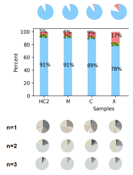 結合單細胞 RNA 測序的注釋結果,對每個樣本針對不同類型的細胞群進行克隆擴增分析。如下餅圖,針對不同的克隆擴增(n=1,n=2,n>=3)情況分別統(tǒng)計,不同顏色表示不同類型的細胞類型所占比例。