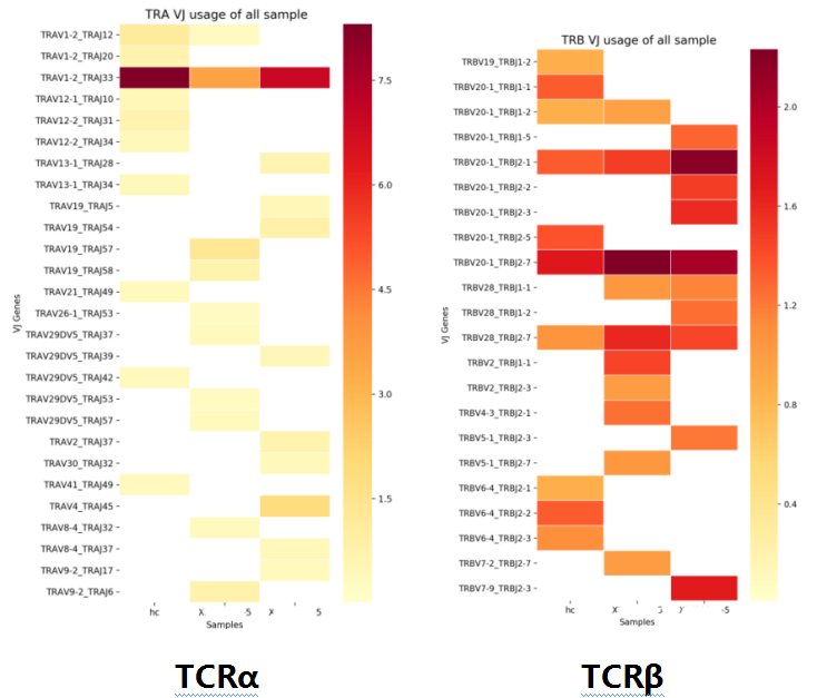 每個樣本分別取 α 和 β 排名前十的 VJ 組合,所有樣本取并集畫 VJ 使用率熱圖。