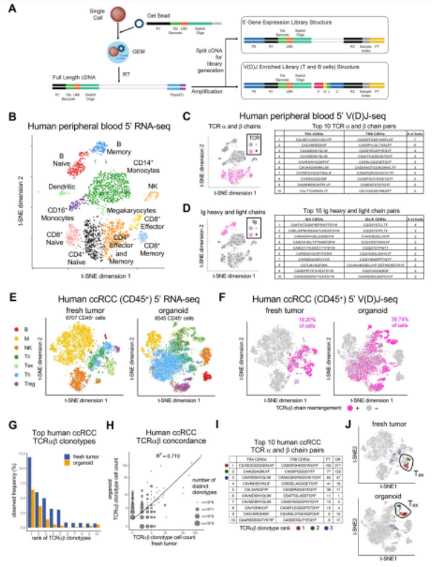 原發(fā)腫瘤上皮細胞與內源性同系腫瘤浸潤淋巴細胞(TILs) 作為內聚單位的共培養(yǎng)尤其難以實現(xiàn)。研究人員運用空氣 - 液體界面(ALI) 方法從 >100 個人活組織切片或小鼠腫瘤中培養(yǎng)出患者來源的器官樣體(PDOs),在具有同基因免疫能力的宿主中作為腫瘤上皮細胞,并嵌入天然免疫細胞。10X Genomics Chromium 平臺通過同時檢測基因表達及免疫組庫圖譜發(fā)現(xiàn),PDOs 腫瘤浸潤淋巴細胞準確地保留了原發(fā)腫瘤 T 細胞受體(TCR) 的圖譜。至關重要的是,人類和小鼠的 PDOs 成功地通過 anti-PD1 和 / 或 anti-PDL1 擴展和激活腫瘤抗原特異性腫瘤浸潤淋巴細胞并誘導腫瘤細胞毒性來模擬免疫檢查點阻斷(ICB)。內源性免疫基質與原發(fā)腫瘤上皮細胞的有機融合促進 TME 內的免疫腫瘤學研究,并促進個性化免疫治療檢測。